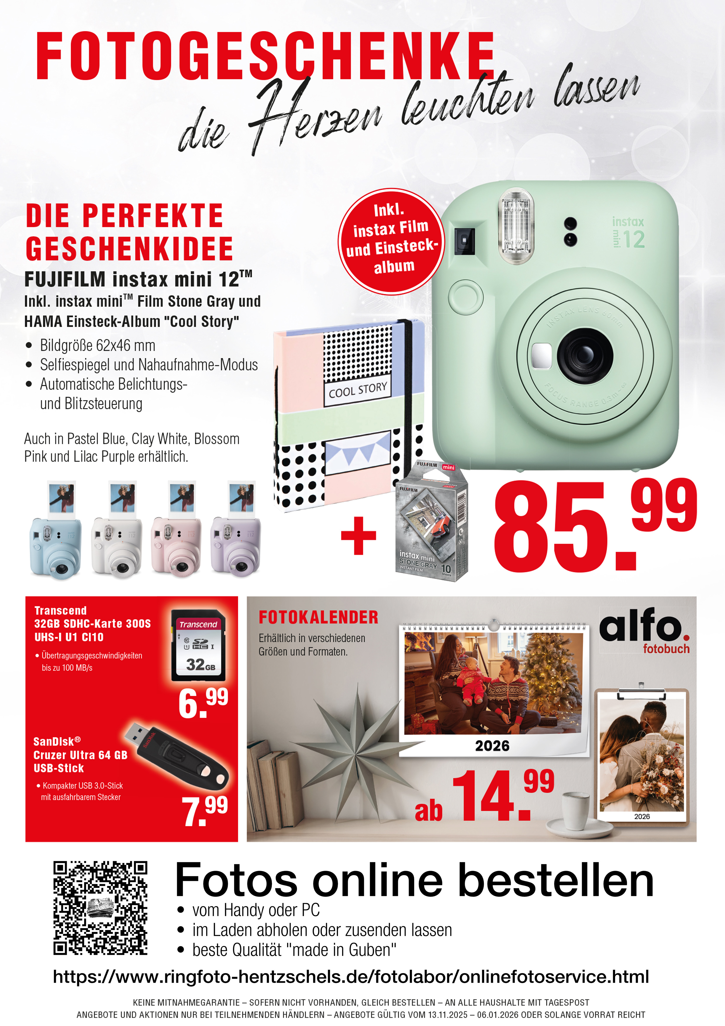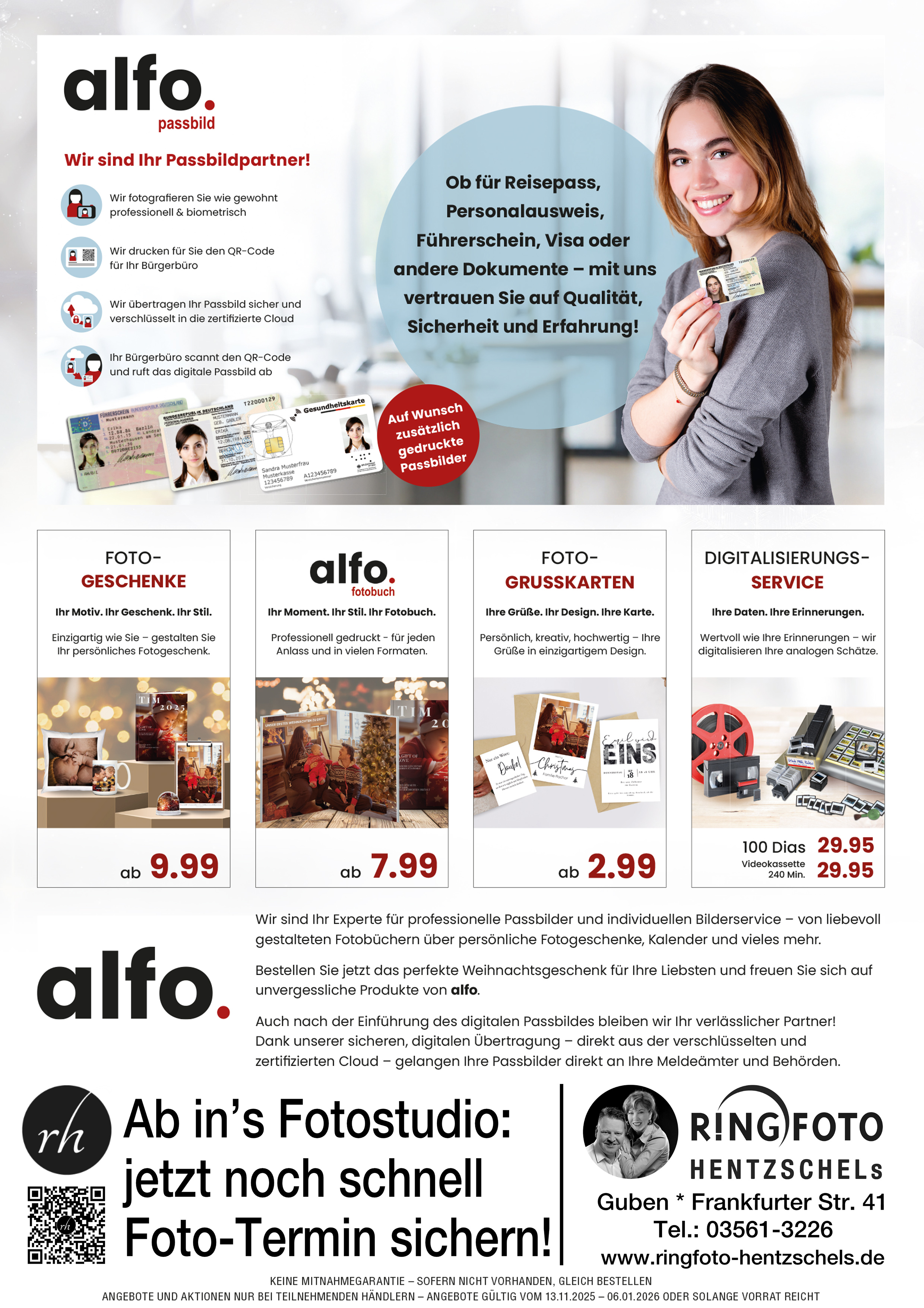 In dieser festlichen Jahreszeit möchten wir Ihre schönsten Erinnerungen zum Strahlen bringen. Alle Fotogeschenke und Drucke – von hochwertigen Fotoabzügen über großformatige XXL-Poster bis hin zu beeindruckenden Fotogeschenken – produzieren wir mit viel Sorgfalt selbst in unserem Ladengeschaft in Guben. In unserem Fotostudio entstehen auf Wunsch zauberhafte Portraits für Familie, Freunde oder als ganz persönliches Geschenk.